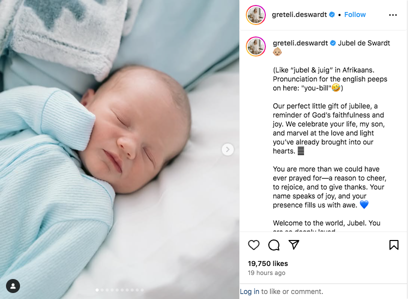 The actress named her newborn son Jubel de Swardt, describing his arrival as a powerful reminder of Godβs faithfulness. βWe celebrate your life, my son, and marvel at the love and light youβve already brought into our hearts,β Greteli shared. She also reflected on the significance of his name, which symbolizes joy. βYou are more than we could have ever prayed forβa reason to cheer, to rejoice, and to give thanks,β she continued.