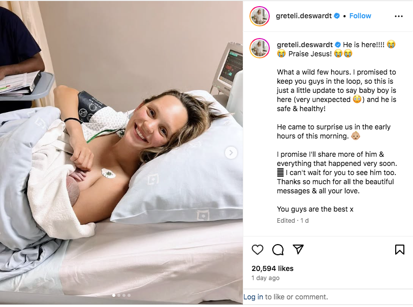 Greteli revealed that her baby boy arrived unexpectedly in the early hours of the morning, catching the couple by surprise. While she promised to share more details soon, she expressed her gratitude for the outpouring of love from her fans. βThank you so much for all the beautiful messages and your love. You guys are the best,β she said.