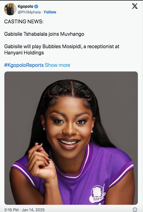 South African actress and TV personality Gabisile Tshabalala has landed a new role on Muvhango, one of Mzansi’s most popular soap operas. The exciting news was shared by entertainment commentator Phil Mphela, who revealed that Tshabalala would be portraying Bubbles Mosipidi, a receptionist at Hanyani Holdings. The announcement has sparked a wave of excitement among her fans and the entertainment industry.