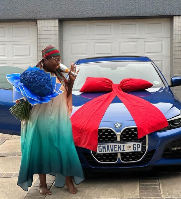 Gogo Maweni is truly ending 2024 on a high note. In addition to the recent car purchase, the star has added multiple properties to her portfolio and even celebrated a lavish traditional wedding that nearly broke the internet. Her new blue BMW, paired with a matching bouquet of blue flowers, is just the latest in a string of eye-catching acquisitions. The photo, shared by controversial entertainment blogger Musa Khawula, shows Gogo Maweni standing proudly next to her new ride, with the caption reading: “Dr Maweni celebrates purchasing a new car.”
