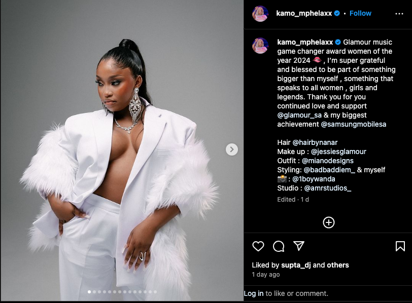 After receiving the award, Kamo shared her gratitude on Instagram, expressing how honored she felt to be recognized as part of something greater than herself. In her heartfelt message, she celebrated the significance of the award, not just for her, but for all women, girls, and legends who continue to break barriers and make their mark in the world. “I’m super grateful and blessed,” she wrote, underscoring the collective empowerment that such recognition embodies.