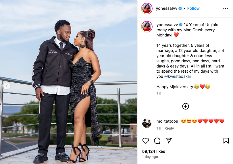 14 years of Umjolo today with my Man Crush every Monday! β€οΈ” Yolanda wrote. “14 years together, 5 years of marriage, a 12-year-old daughter, a 4-year-old daughter, and countless laughs, good days, bad days, hard days, and easy days. All in all, I still want to spend the rest of my days with you @kwestadakar. Happy Mjoloversary πβ€οΈπβ