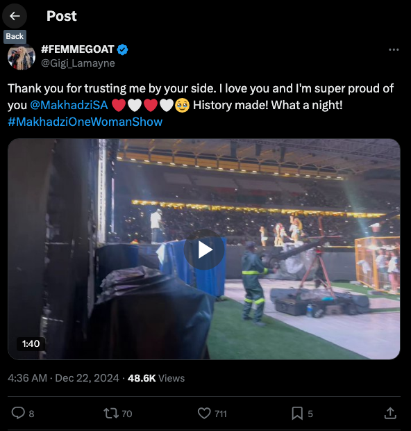Gigi Lamayne performed with Makhadzi and took to social media to thank her for the opportunity. “Makhadzi’s electrifying performance wowed Cassper Nyovest,” who congratulated her on filling the stadium. “Wow, wow, wow, wow !!!! Congratulations to Makhadzi for filling up Peter Mokaba stadium!!! #MakhadziOneWomanShow.”