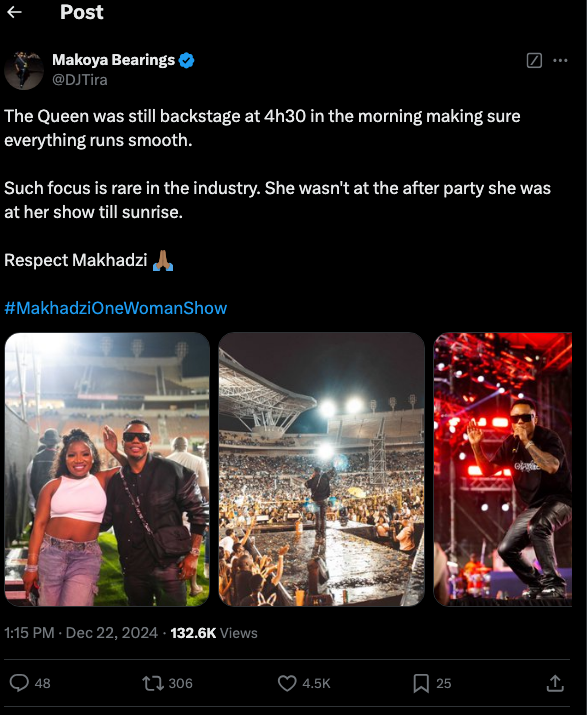 DJ Tira gave Makhadzi her flowers for her hard work, sharing pictures from the concert and commending her focus and determination. “The Queen was still backstage at 4h30 in the morning making sure everything runs smooth. Such focus is rare in the industry. She wasn’t at the after-party. She was at her show till sunrise. Respect Makhadzi”