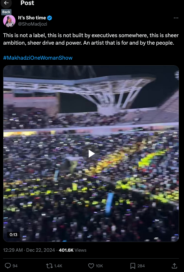 Fellow Limpopo singer Sho Madjozi also congratulated Makhadzi on her successful show. “This is not a label, this is not built by executives somewhere, this is sheer ambition, sheer drive and power. An artist that is for and by the people.” Makhadzi’s historic show has left a lasting impression on the music industry and her fans.