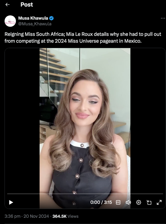 In a heartfelt video shared by Musa Khawula on social media platform X (formerly Twitter), Mia detailed her struggles during the pageant and her decision to step back.