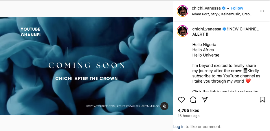 “Iβm beyond excited to finally share my journey after the crown π€ Kindly subscribe to my YouTube channel as I take you through my world.β