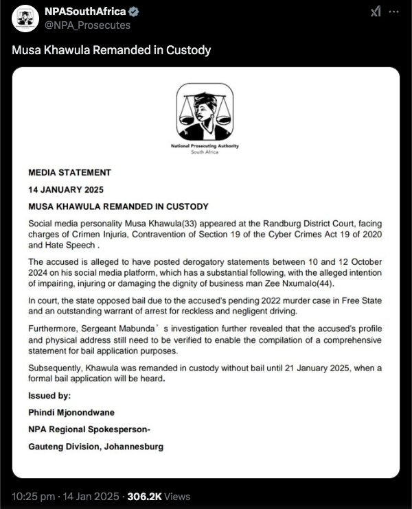 According to the NPA, Khawulaβs arrest stems from derogatory statements he allegedly posted between October 10 and 12, 2024, targeting businessman Zee Nxumalo. The posts, which were shared on Khawulaβs widely followed social media platforms, are said to have been intended to damage Nxumalo’s dignity. The stateβs decision to oppose Khawula’s bail was also influenced by his pending involvement in a 2022 murder case in Free State, as well as an outstanding warrant for reckless and negligent driving.