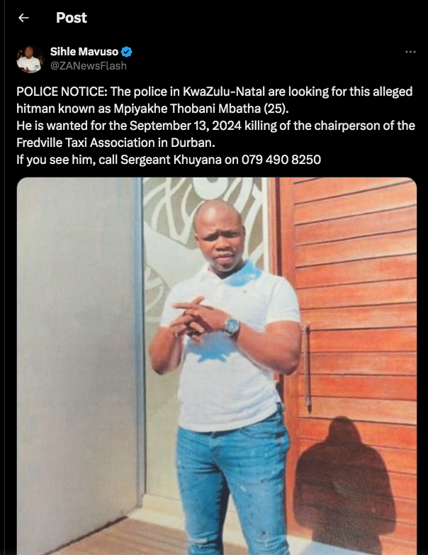 KwaZulu-Natal police are urgently seeking the public’s assistance in locating Mpiyakhe Thobani Mbatha (25), a suspected hitman wanted for the murder of Mphilisi Ngubane, the chairperson of the Fredville Taxi Association. Mbatha is also accused of attacking Ngubane’s twin brother in the same ambush.