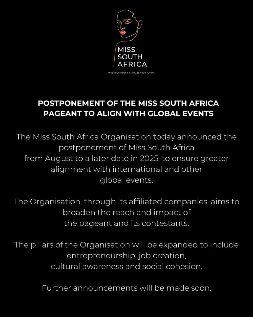 The Miss South Africa Organisation has officially postponed its highly anticipated annual pageant, which was originally scheduled to take place in August 2025. A new date has yet to be confirmed.