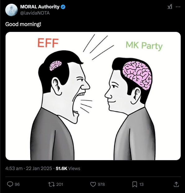 Nota Baloyi is once again at the center of controversy, this time targeting the Economic Freedom Fighters (EFF) in a scathing post on X (formerly Twitter). The former music executive, known for his unapologetic outbursts, took aim at the political party by sharing a meme suggesting that “empty vessels make the most noise.” In his post, he insinuated that the EFF’s members had small brains compared to those in the uMkhonto we Sizwe (MK) Party, fueling a firestorm of reactions.