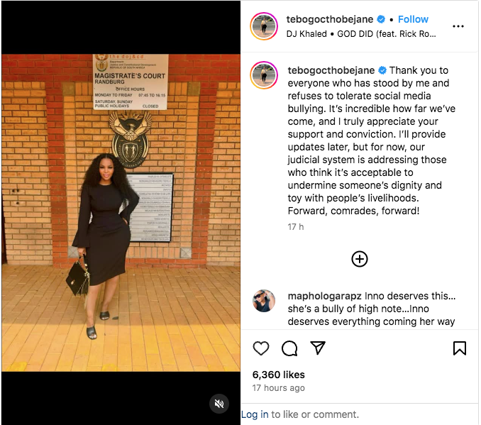 South African social media influencer and entrepreneur Tebogo Thobejane has given her followers an inspiring update on her ongoing fight against cyberbullying. The popular “Mzansi baddie” recently shared a video on social media, standing outside a Johannesburg Magistrate’s Court, hinting at her legal victory in a defamation case she filed against a former friend, Inno Morolong.